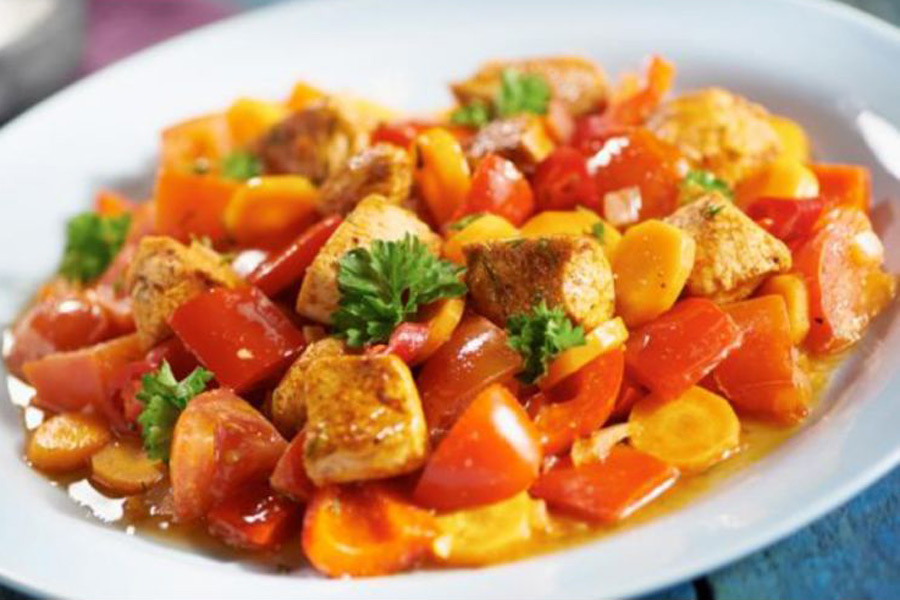 INGREDIENTE PUI BUNICA: piept de pui (140 grame), ardei kapia (50 grame), ciuperci (50 grame), sos de rosii (50 grame).