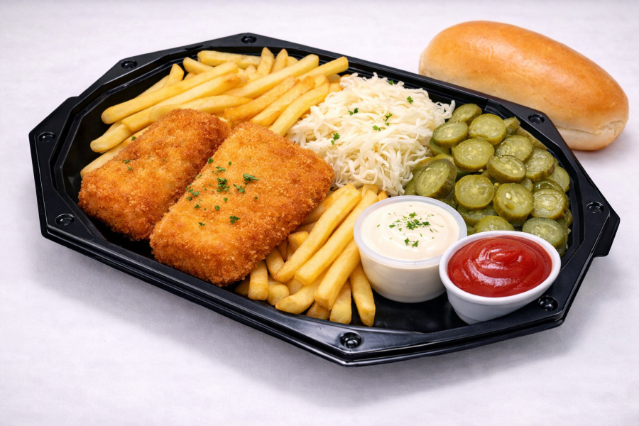 INGREDIENTE MENIU CAȘCAVAL PANE: cartofi prăjiți (150 grame), cașcaval pane (150 grame), salate (100 grame), ketchup (50 grame), sos de maioneză cu usturoi (50 grame), chiflă (100 grame).