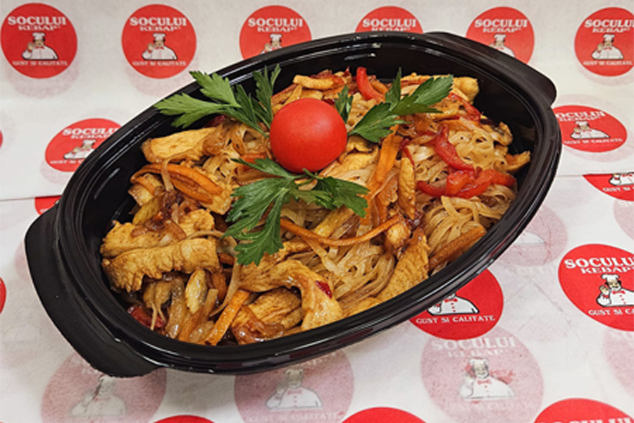 INGREDIENTE PASTE DE OREZ CU PUI: paste de orez (130 grame), piept de pui (130 grame), legume: ciuperci,ceapă,morcov,ardei kapia (70 grame), sos de chilli (20 grame), sos de soia (10 grame).