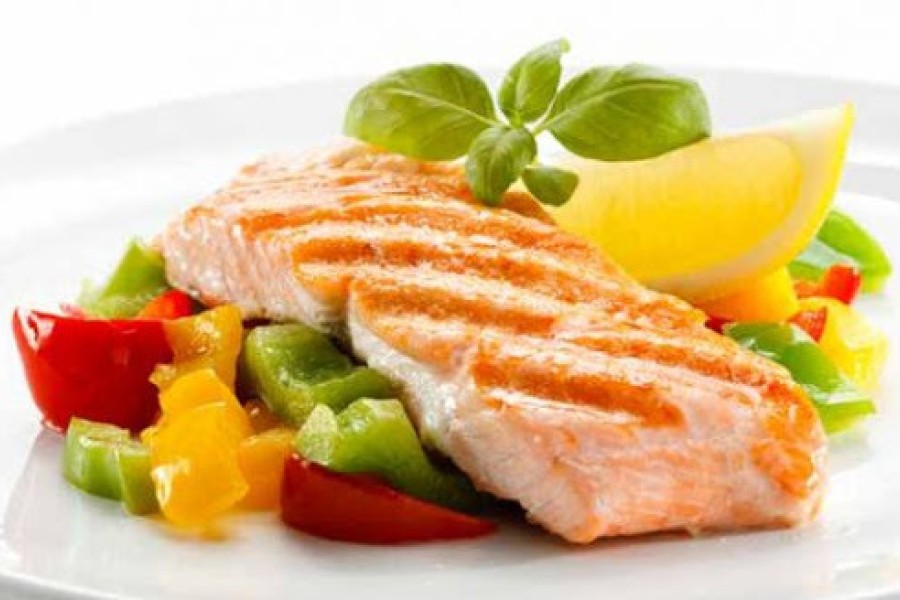 INGREDIENTE SOMON LA GRĂTAR: file de somon (200 grame), legume sotate: Baby Morcov (100 grame) sau cartofi natur (150 grame),Fasole Verde (50 grame), Porumb (50 grame), Mazăre (50 grame), Ardei Kapia (50 grame),Mujdei de Usturoi (50 grame), Lămâie (50 grame).