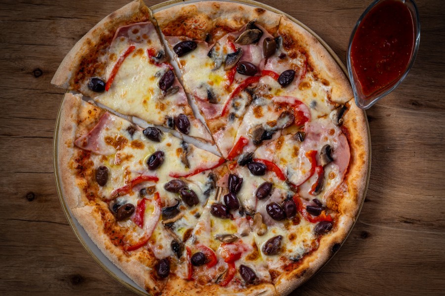 INGREDIENTE PIZZA CAPRICIOSA (32cm) : blat pizza mediu (300 grame),mozzarella (200 grame),șuncă (80 grame),ciuperci (40 grame),măsline (40 grame)