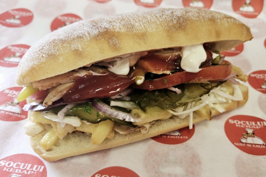 INGREDIENTE BAGHETĂ AMESTEC: carne de vită (75 grame), carne de pui (75 grame), lipie (50 grame),cartofi prajiti (50 grame),salate (50 grame),ketchup (50 grame), sos de maioneza cu usturoi (50 grame)