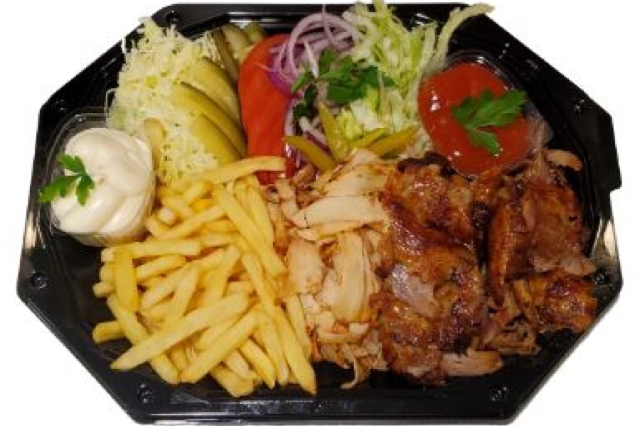 INGREDIENTE SHAORMA DE VITĂ LA FARFURIE: carne de pui (170 grame), carne vită (170 grame),lipie (50 grame),cartofi prăjiți (100 grame),salate (50 grame),ketchup (50 grame), sos de maioneza cu usturoi (50 grame)