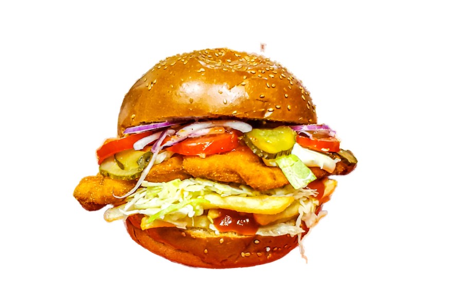 INGREDIENTE ȘNIȚEL DE PUI LA CHIFLĂ: chiflă hamburger (80 grame), cartofi prăjiți (100 grame), piept de pui (100 grame), ketchup (50 grame), sos de maioneză cu usturoi ( 50 grame),castraveți murați (50 grame), varză albă (50 grame).